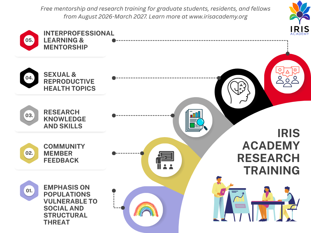 The IRIS Academy is an interprofessional program on sexual health, fertility, and relationship science for trainees looking to learn more about research, program evaluation, and quality improvement in interprofessional clinical care. This program is free, augments credit-earning curricula and includes an engagement-based stipend.
